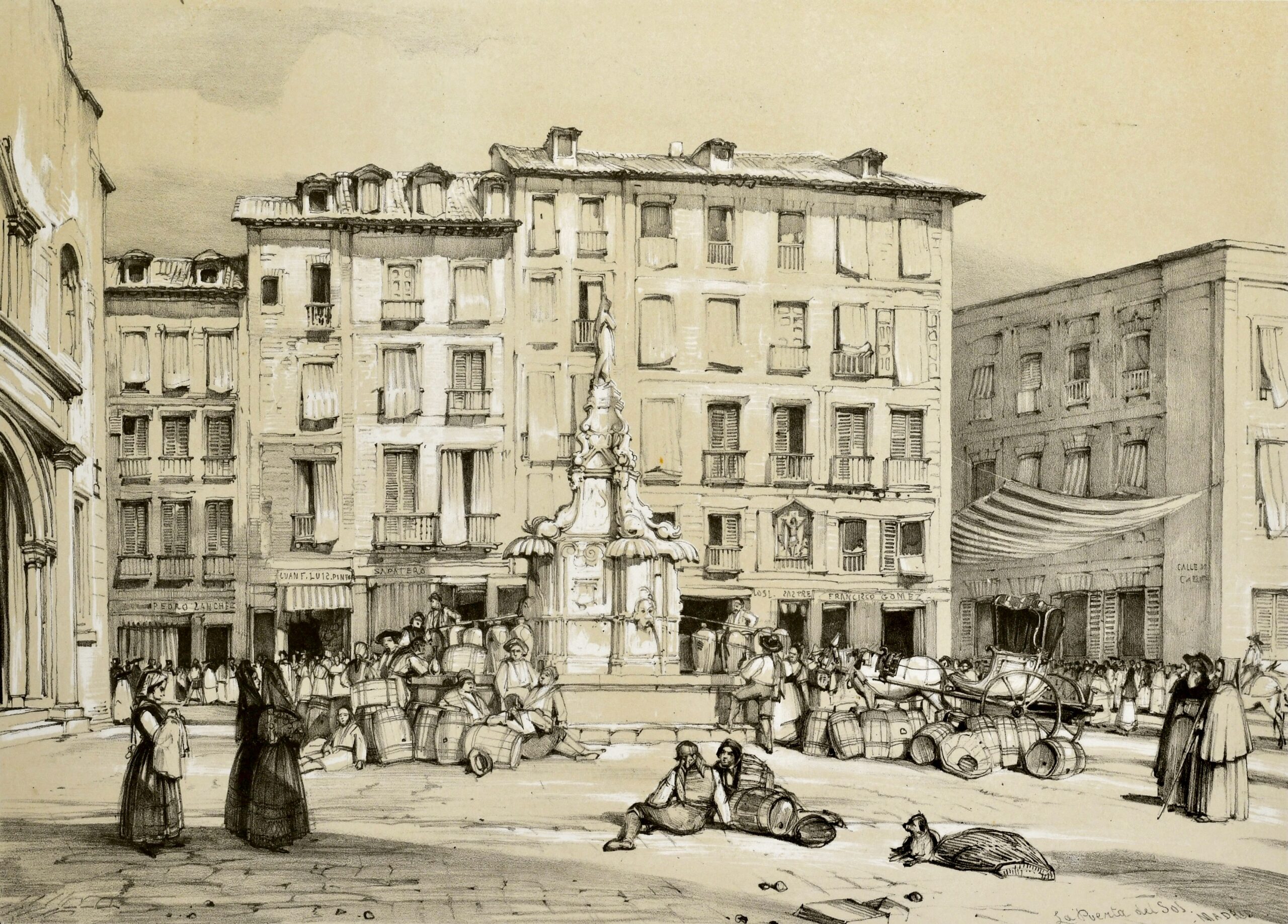 Roberts stayed for three weeks in Madrid between 16 December 1832 and 9 January 1833. He felt ambivalent about the capital. He preferred Burgos, where he had spent a week sketching the Gothic cathedral before arriving in the capital. In Madrid, he disliked the food and the cold winter. However, he was impressed by the Prado Museum’s collection of paintings and sketched a number of urban views of Madrid. Apart from the one shown here, he depicted the Puerta de Alcalá and several monumental fountains built as part of the city’s eighteenth-century urban reforms.